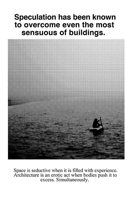 I recently discovered the work of Bernard Tschumi’s advertisements for architecture. He realized so many people experienced architecture through images and wanted to create desire.